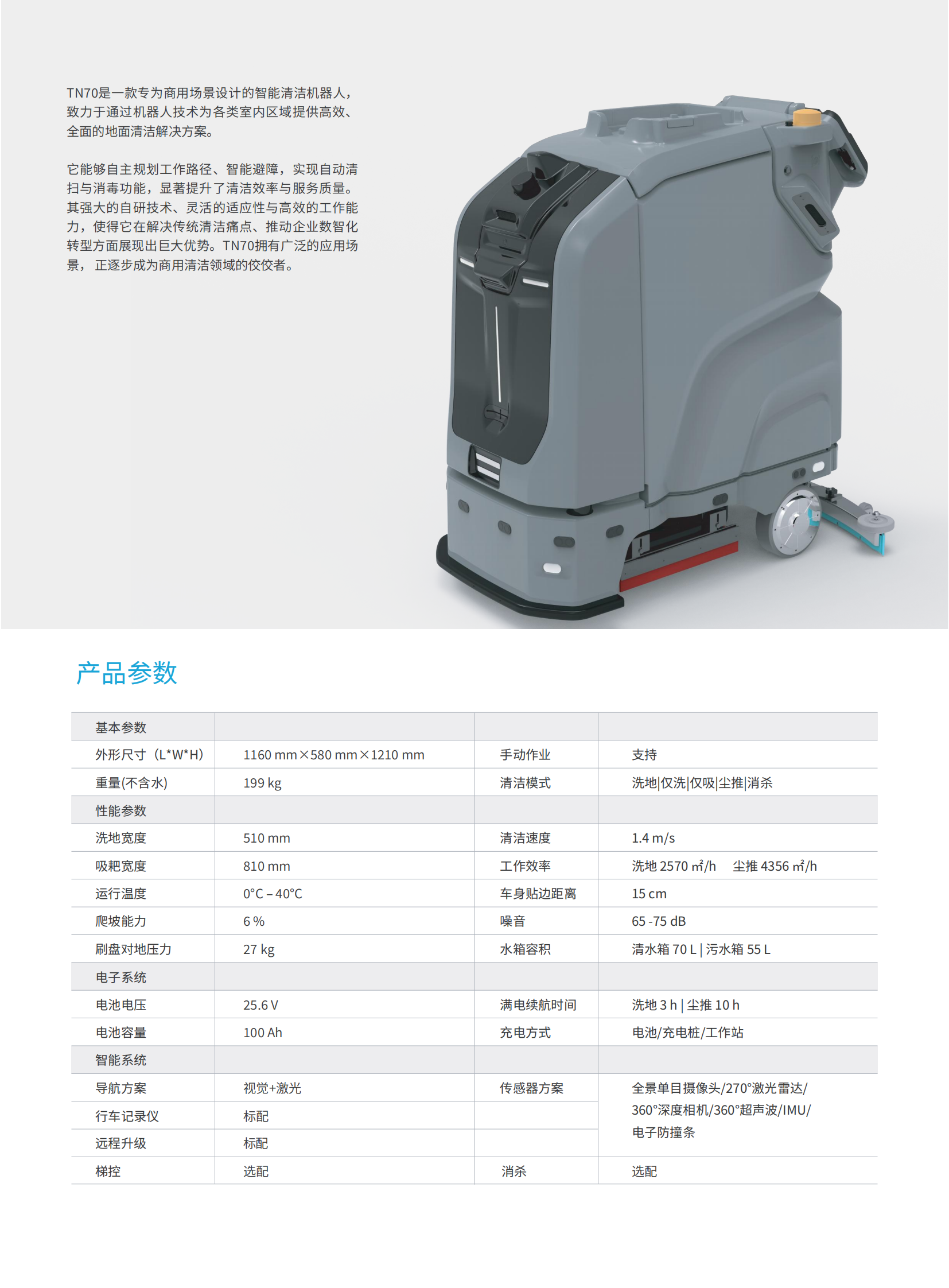 TN70 智能清潔機器人: TN70是一款專為商用場景設(shè)計的智能清潔機器人,致力于通過機器人技術(shù)為各類室內(nèi)區(qū)域提供高效、全面的地面清潔解決方案。它能夠自主規(guī)劃工作路徑、智能避障,實現(xiàn)自動清掃與消毒功能,顯著提升了清潔效率與服務(wù)質(zhì)量。其強大的自研技術(shù)、靈活的適應(yīng)性與高效的工作能力,使得它在解決傳統(tǒng)清潔痛點、推動企業(yè)數(shù)智化轉(zhuǎn)型方面展現(xiàn)出巨大優(yōu)勢。TN70擁有廣泛的應(yīng)用場景,正逐步成為商用清潔領(lǐng)域的佼佼者。