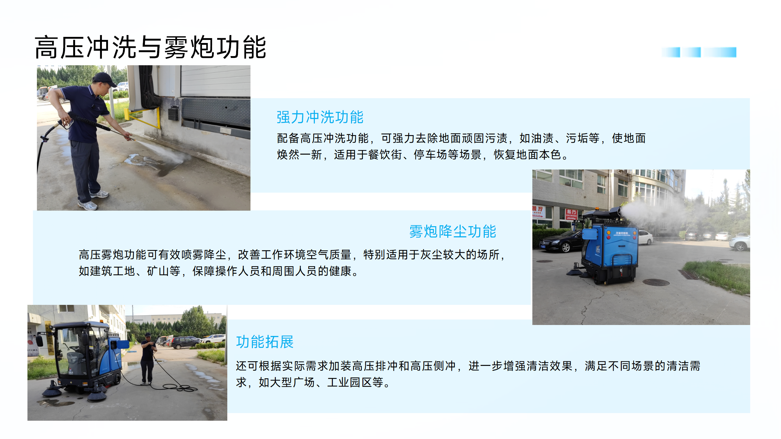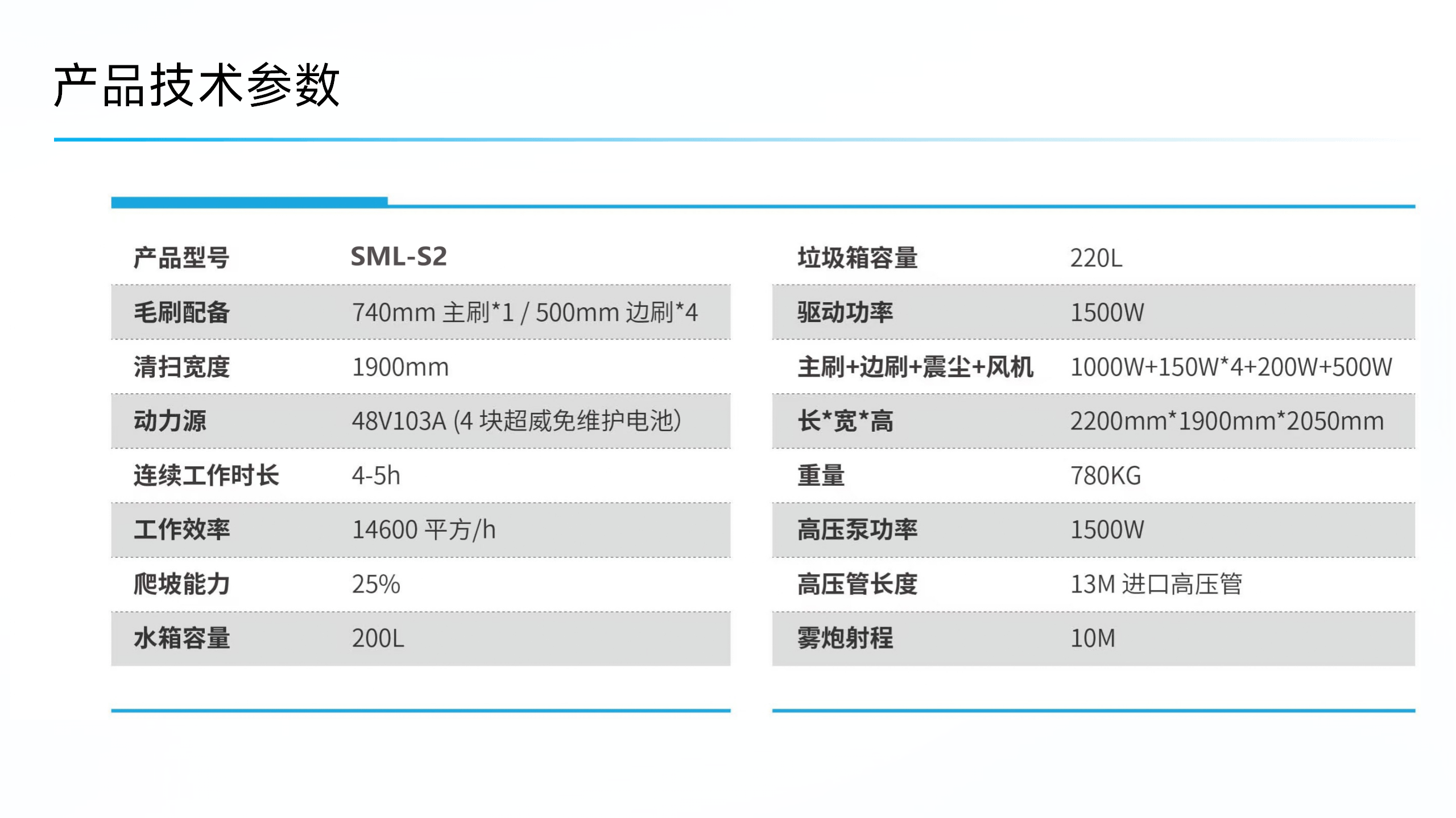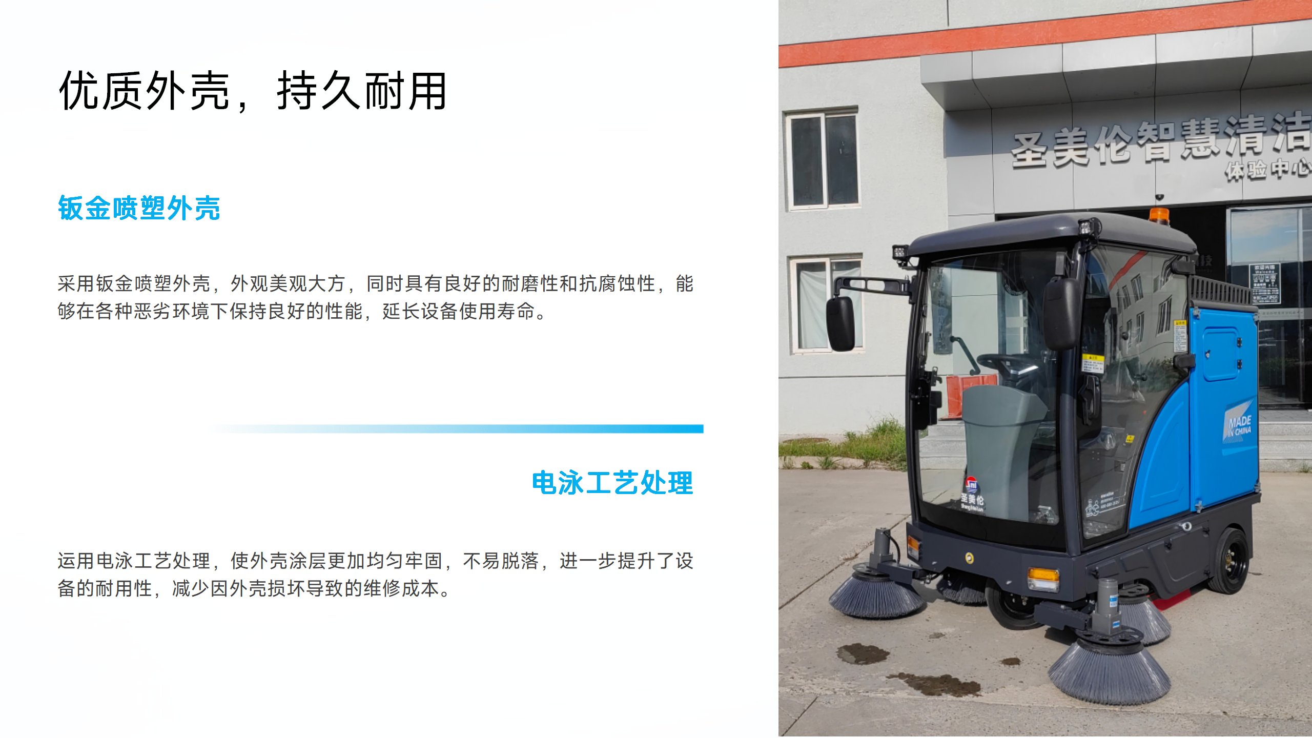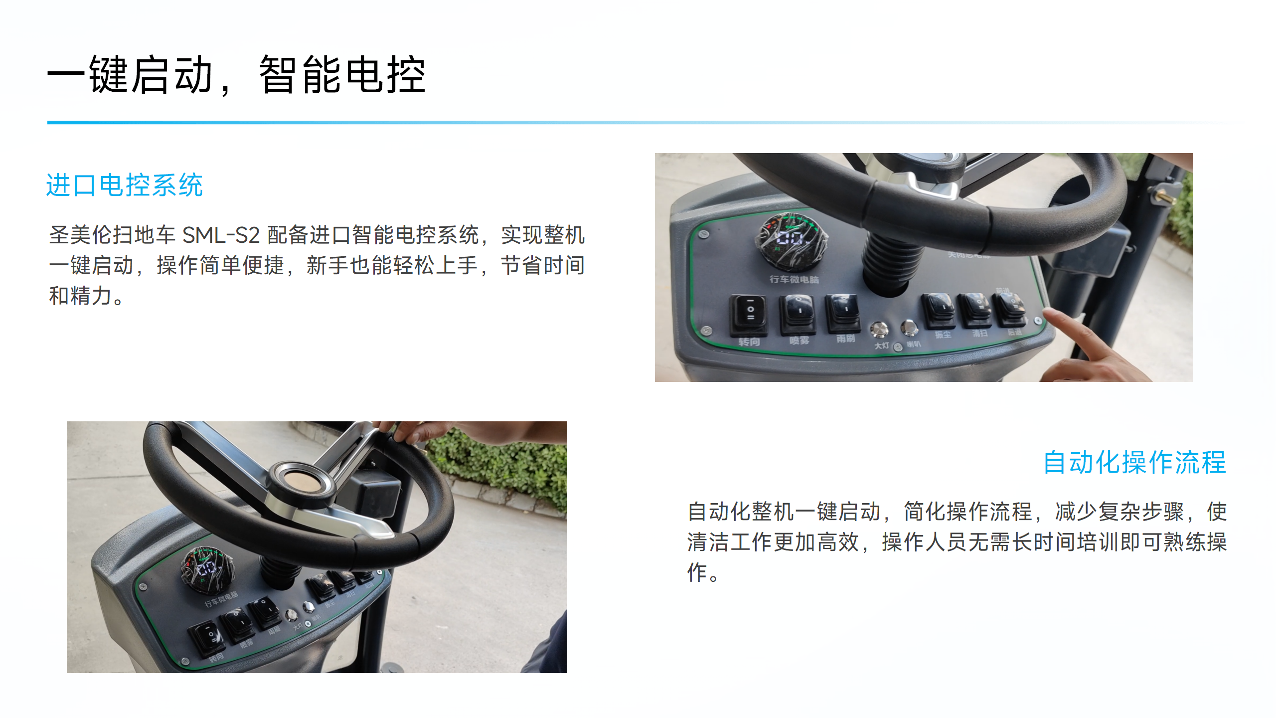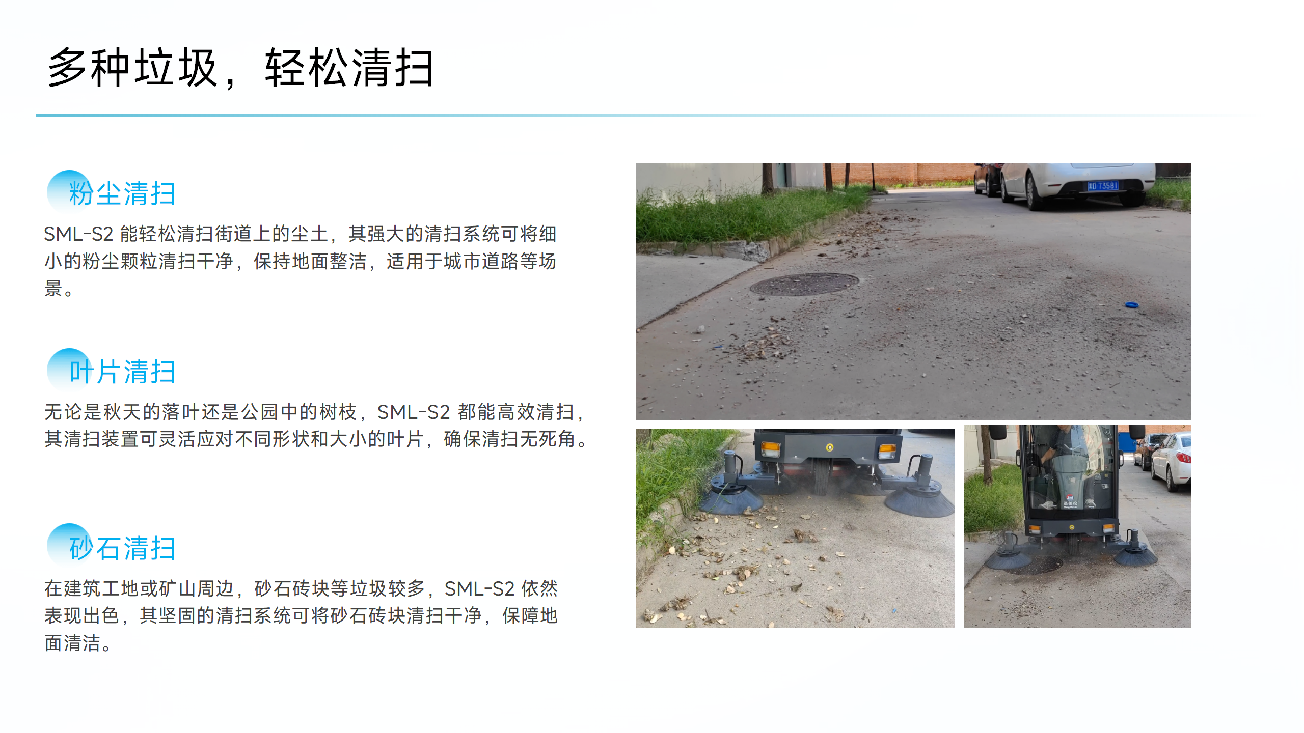 SML-S2 多功能駕駛式掃地車: 這款掃地車性能強(qiáng)勁,清掃寬度達(dá) 1900mm,工作效率高達(dá) 14600 平方米每小時,能高效清掃塵土、樹葉、砂石、磚塊等各種垃圾物。 它配置充足,水箱 200L、垃圾箱 220L,滿足長時間作業(yè)需求;1500W 高壓泵功率,配備高壓沖洗、高壓霧炮功能,還可加裝高壓排沖和高壓側(cè)沖,適合噴霧降塵、沖洗車輛等多種場景。 在硬件與技術(shù)上,采用進(jìn)口智能電控系統(tǒng),支持自動化整機(jī)一鍵啟動;全鋁殼智能國標(biāo)自停 25A 充電器保障充電安全;液壓雙碟剎制動、國標(biāo)集成防水線速提升運(yùn)行穩(wěn)定性;鈑金噴塑外殼結(jié)合電泳工藝,防腐蝕且不易脫落。 更有智能安全輔助系統(tǒng)加持,上坡定點(diǎn)懸停不溜車、下坡自動控速不沖車,大幅提升車輛安全性能,是高效、安全、耐用的清掃利器。